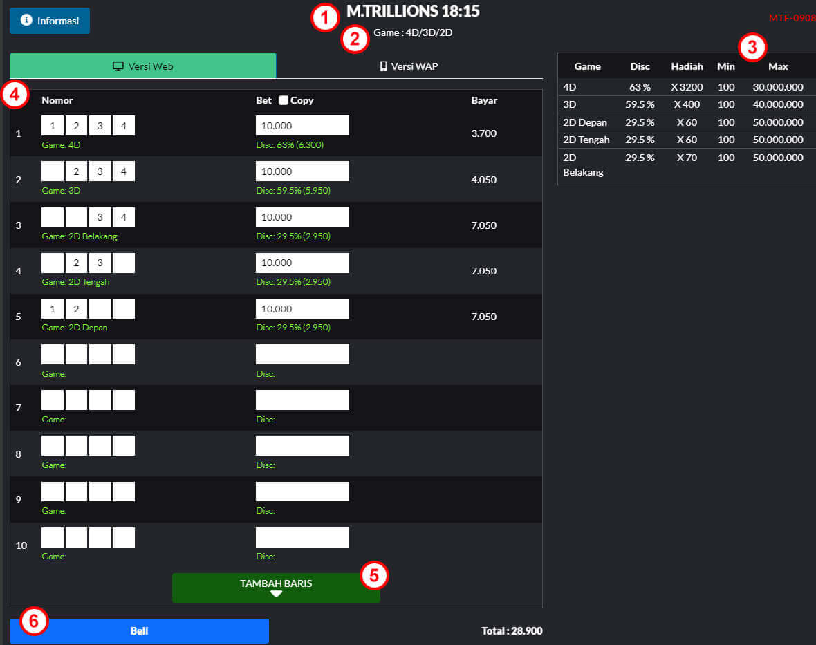 Cara memasang angka taruhan 4D, 3D, 2D belakang, 2D tengah, 2D depan dapat dilihat seperti contoh gambar di atas yang tanda " 4 "